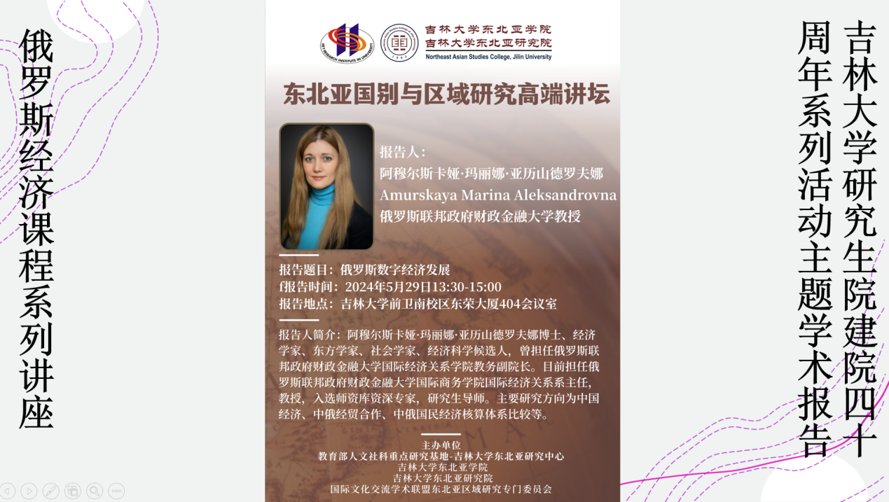 2024年5月29日,“吉林大學(xué)研究生院建院四十周年系列活動主題學(xué)術(shù)報告”、“俄羅斯經(jīng)濟課程系列講座”之“俄羅斯數(shù)字經(jīng)濟現(xiàn)狀及發(fā)展前景”在吉林大學(xué)東北院學(xué)院順利舉辦。本次講座由吉林大學(xué)東北院學(xué)院主辦,在線上、線下同步開展。