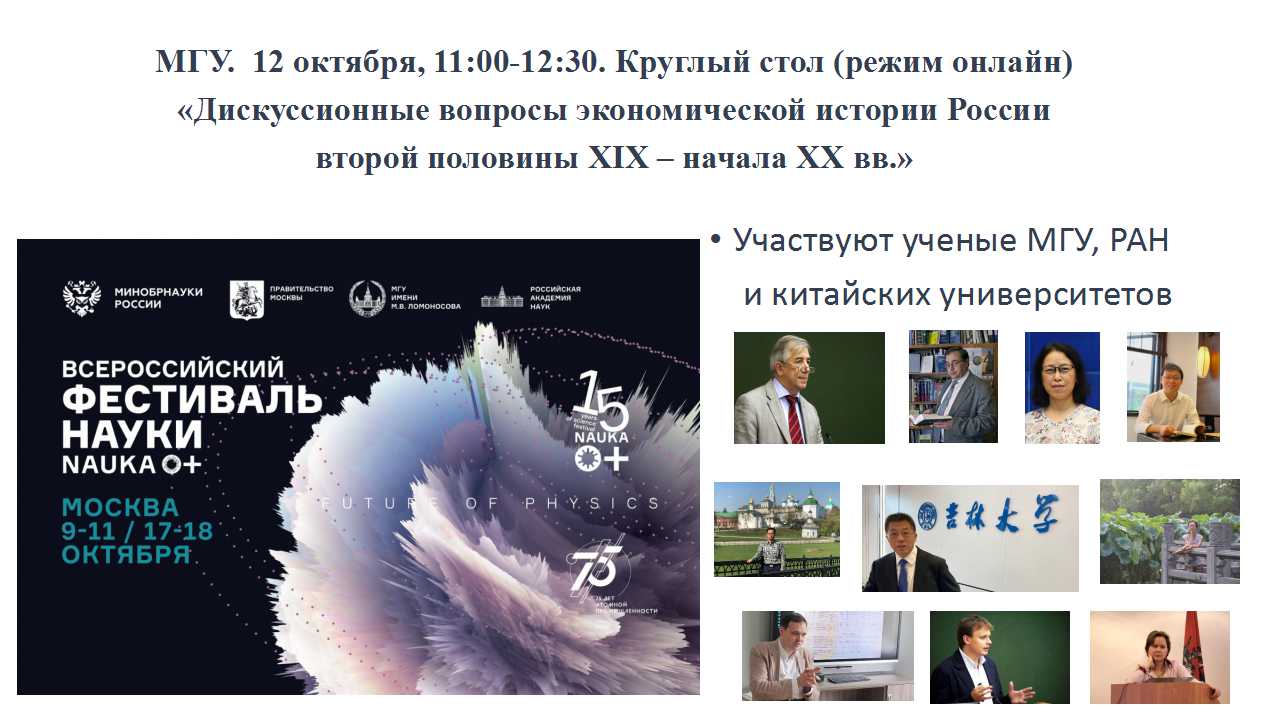 2020年10月12日下午,第十五屆全俄學(xué)術(shù)節(jié)(莫斯科)框架下的首場圓桌論壇“19世紀(jì)下半葉-20世紀(jì)初俄國經(jīng)濟(jì)史研究中的爭議問題”在莫斯科大學(xué)隆重召開。來自莫斯科國立大學(xué)、俄羅斯科學(xué)院、中國四所高校和科研機構(gòu)的近百名專家學(xué)者、學(xué)生齊聚云端。本次活動由莫斯科大學(xué)主辦,吉林大學(xué)東北亞研究院張廣翔教授應(yīng)邀作為圓桌論壇的中方召集人參加會議并做了主旨發(fā)言。來自莫斯科國立大學(xué)和俄羅斯科學(xué)院的列昂尼德·鮑羅德金院士、尤里·彼得羅夫所長、索菲亞·薩羅瑪季娜、季木爾·瓦列托夫、安德烈·瓦羅德津教授,以及來自中國吉林大學(xué)、復(fù)旦大學(xué)、中國社會科學(xué)院、內(nèi)蒙古師范大學(xué)的王曉菊、王學(xué)禮、李振文、袁麗麗等10位學(xué)者共同就俄國經(jīng)濟(jì)史研究中的爭議問題展開了熱烈討論。
