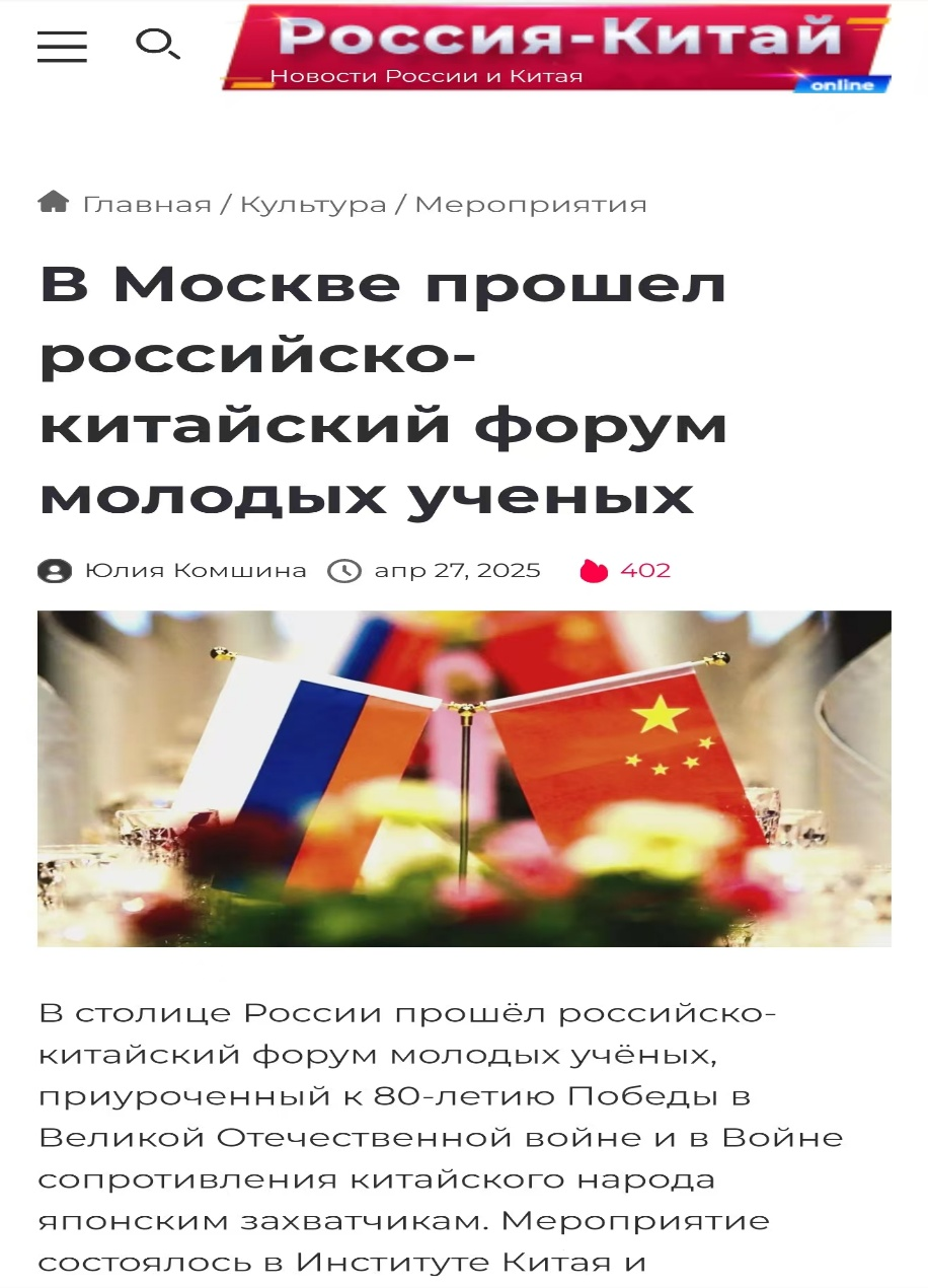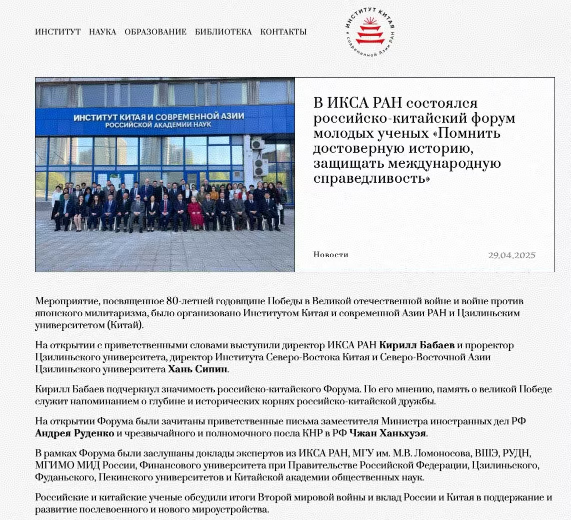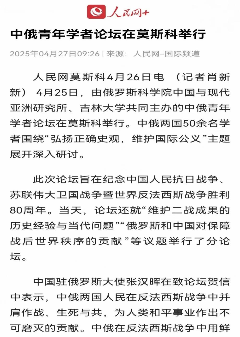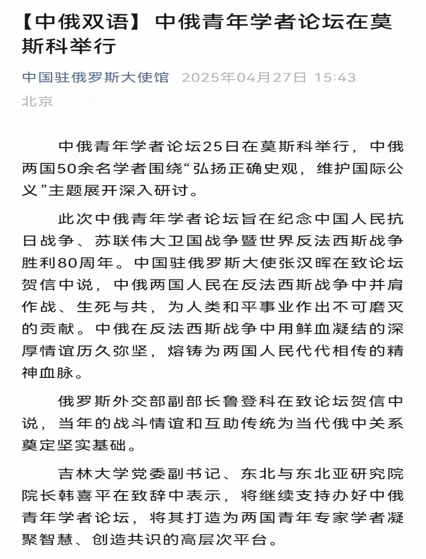 2025年4月25日,由俄羅斯科學(xué)院中國與現(xiàn)代亞洲研究所、吉林大學(xué)東北與東北亞研究院、吉林大學(xué)東北亞研究院、吉林大學(xué)東北亞研究中心、吉林大學(xué)社會科學(xué)研究院聯(lián)合舉辦的“紀(jì)念中國人民抗日戰(zhàn)爭、蘇聯(lián)偉大衛(wèi)國戰(zhàn)爭暨世界反法西斯戰(zhàn)爭勝利80周年中俄青年論壇”在莫斯科成功舉辦。此次會議是踐行中俄兩國元首關(guān)于共慶反法西斯戰(zhàn)爭勝利80周年的重要共識、推動中俄人文與青年交流的重要學(xué)術(shù)活動。此次論壇獲得了中俄兩國外交部門的高度關(guān)注和支持。中華人民共和國駐俄羅斯聯(lián)邦特命全權(quán)大使張漢暉、俄羅斯聯(lián)邦外交部副部長安德烈·魯?shù)强品謩e向論壇致賀信